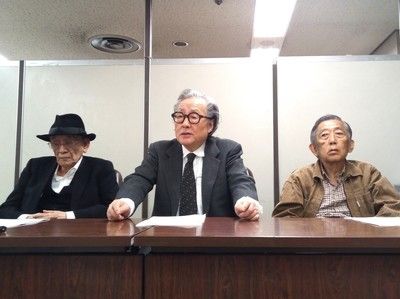 会見に臨んだ矢崎泰久さん(左)、山根二郎さん(中央)、北原賢一さん。